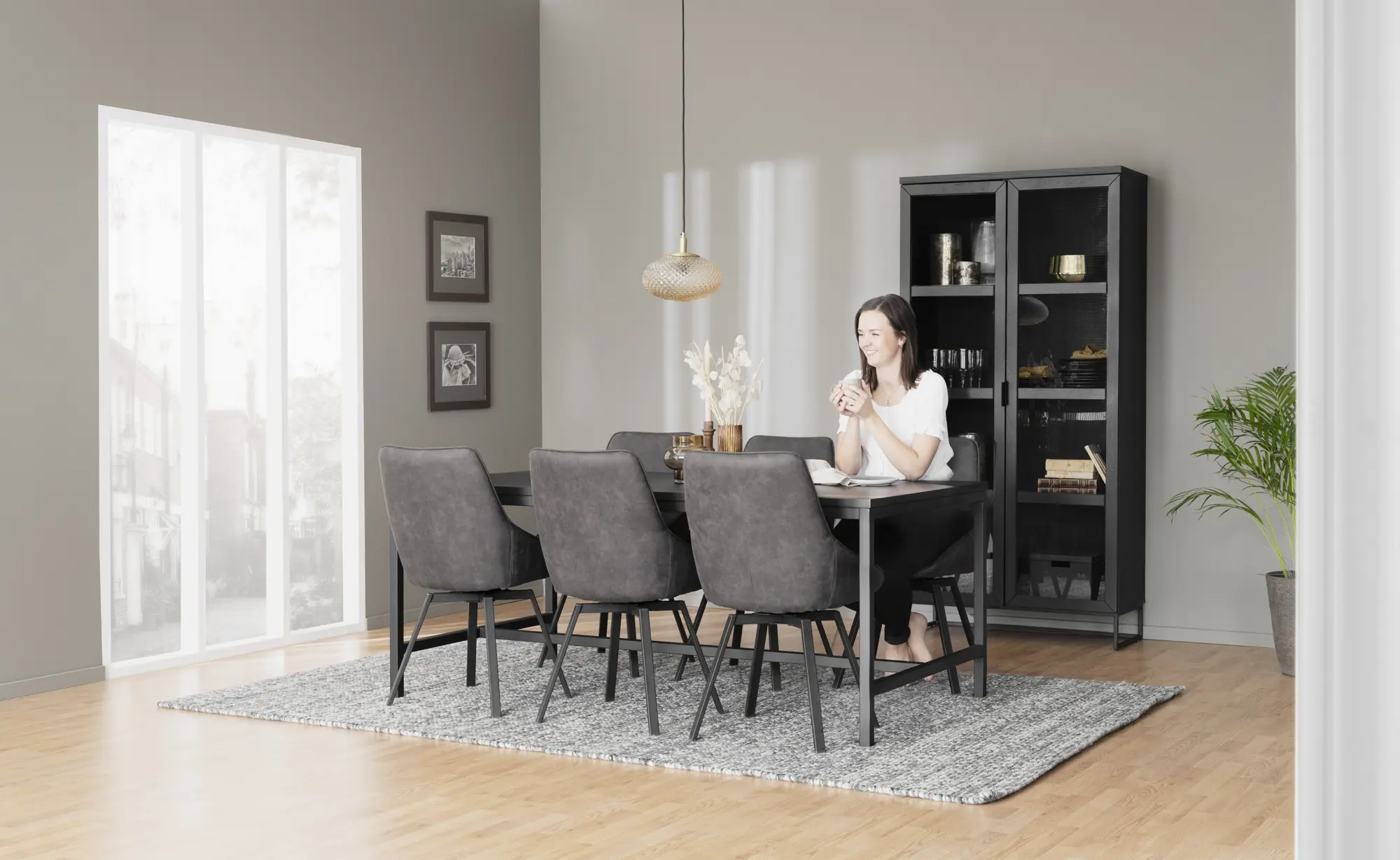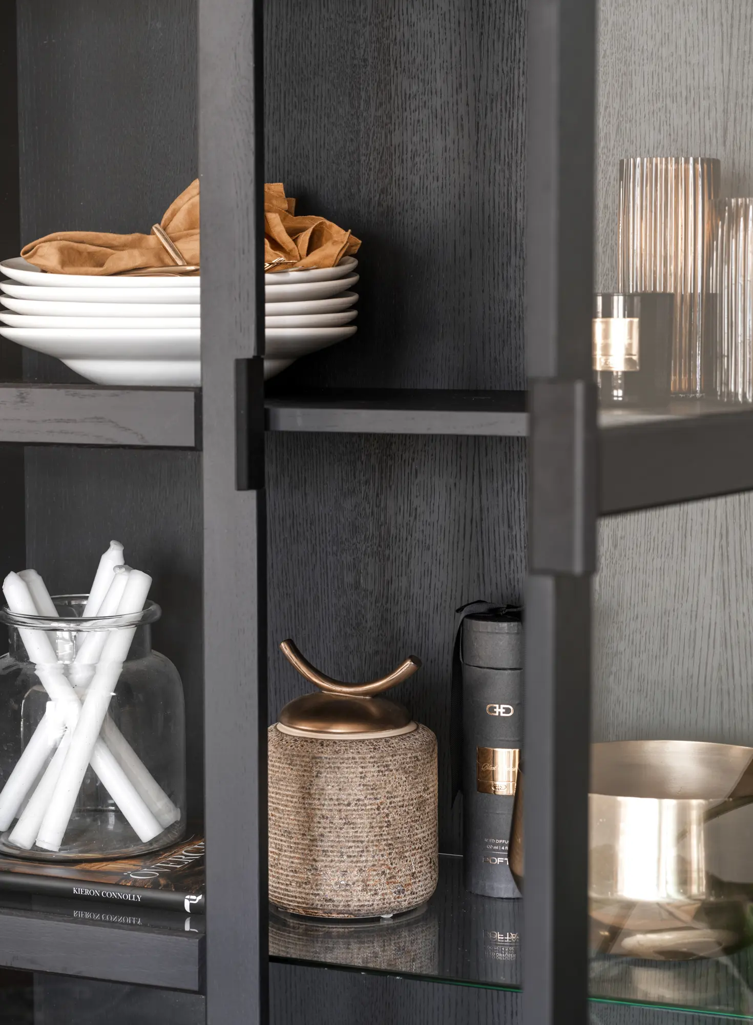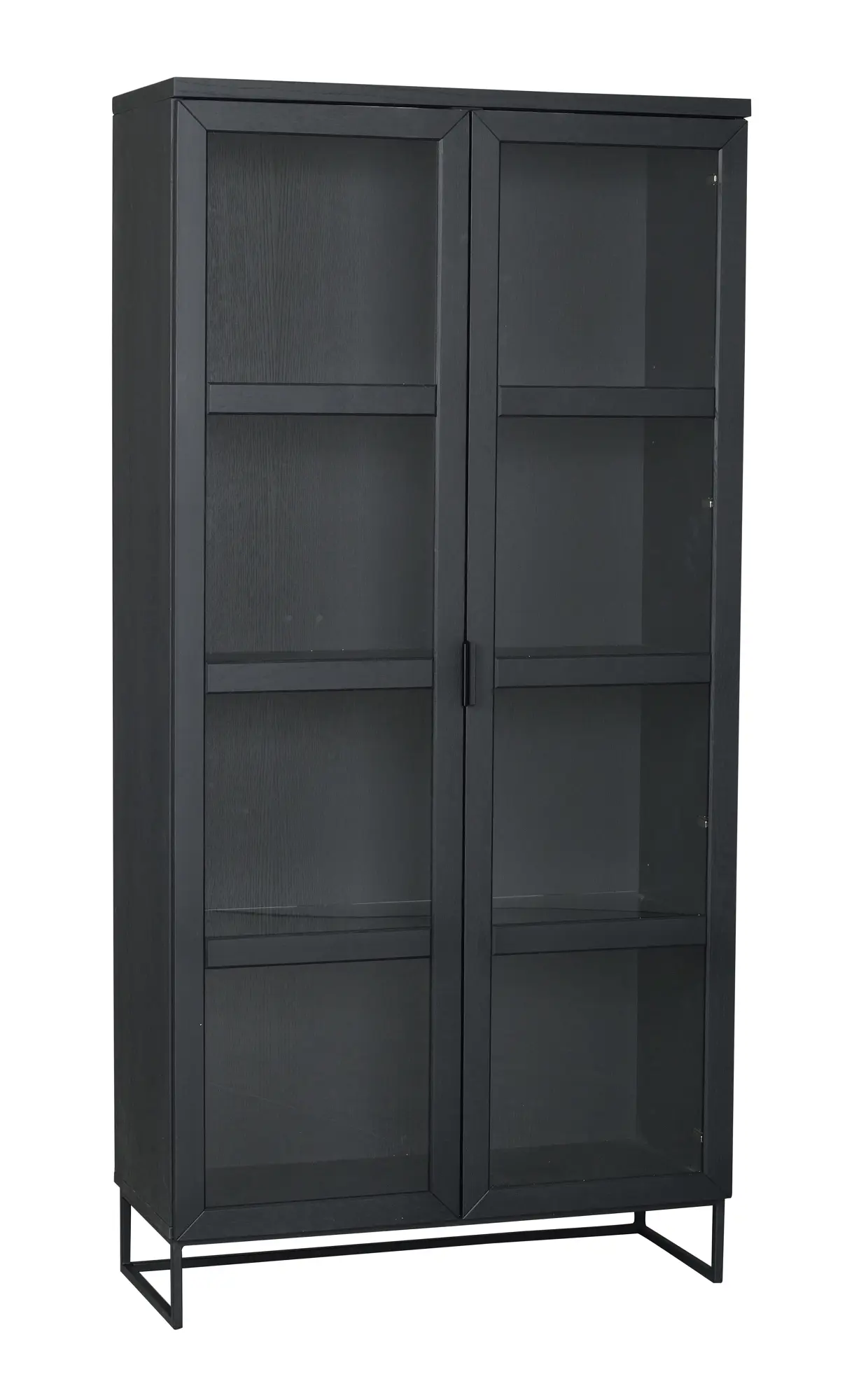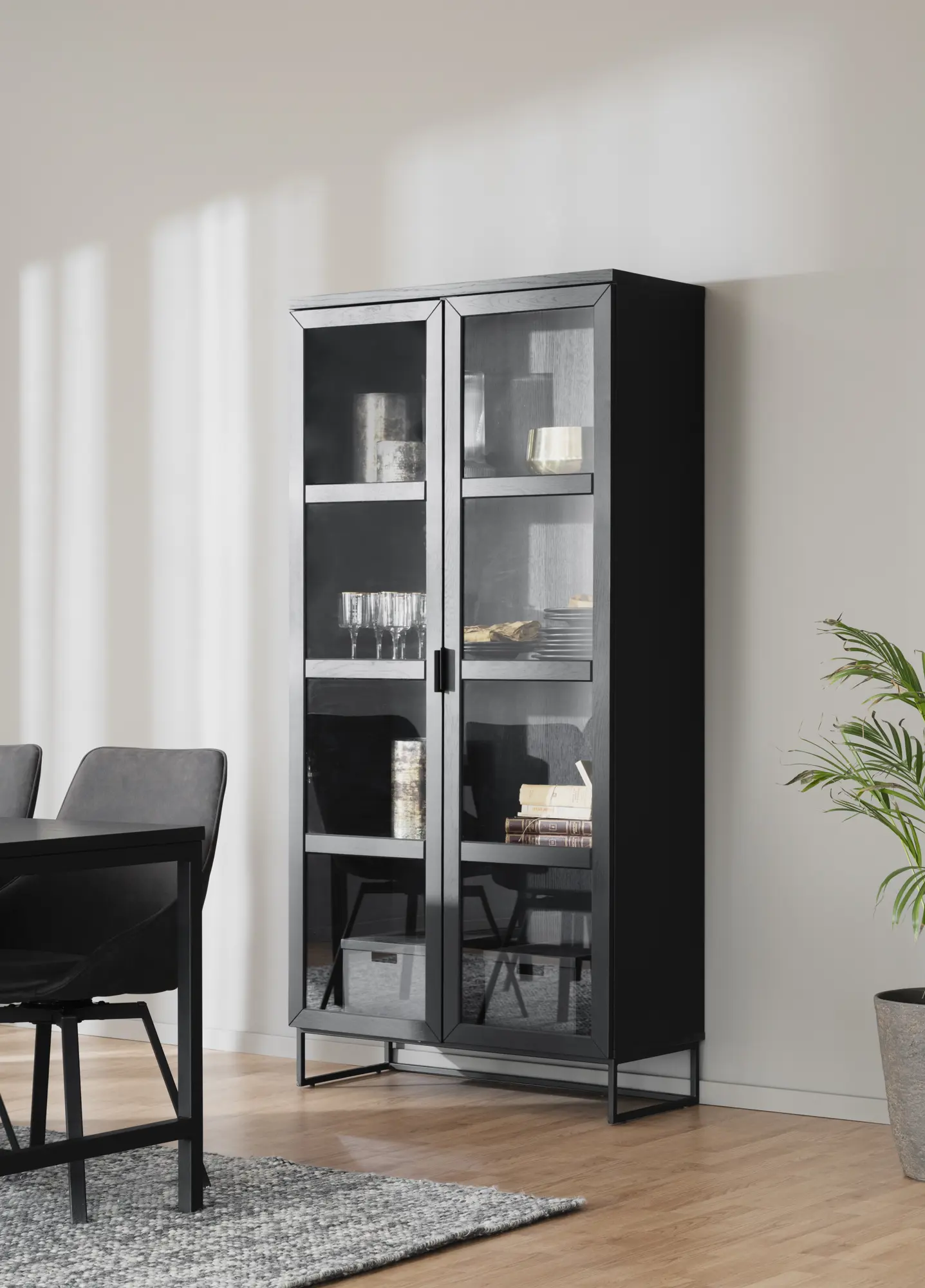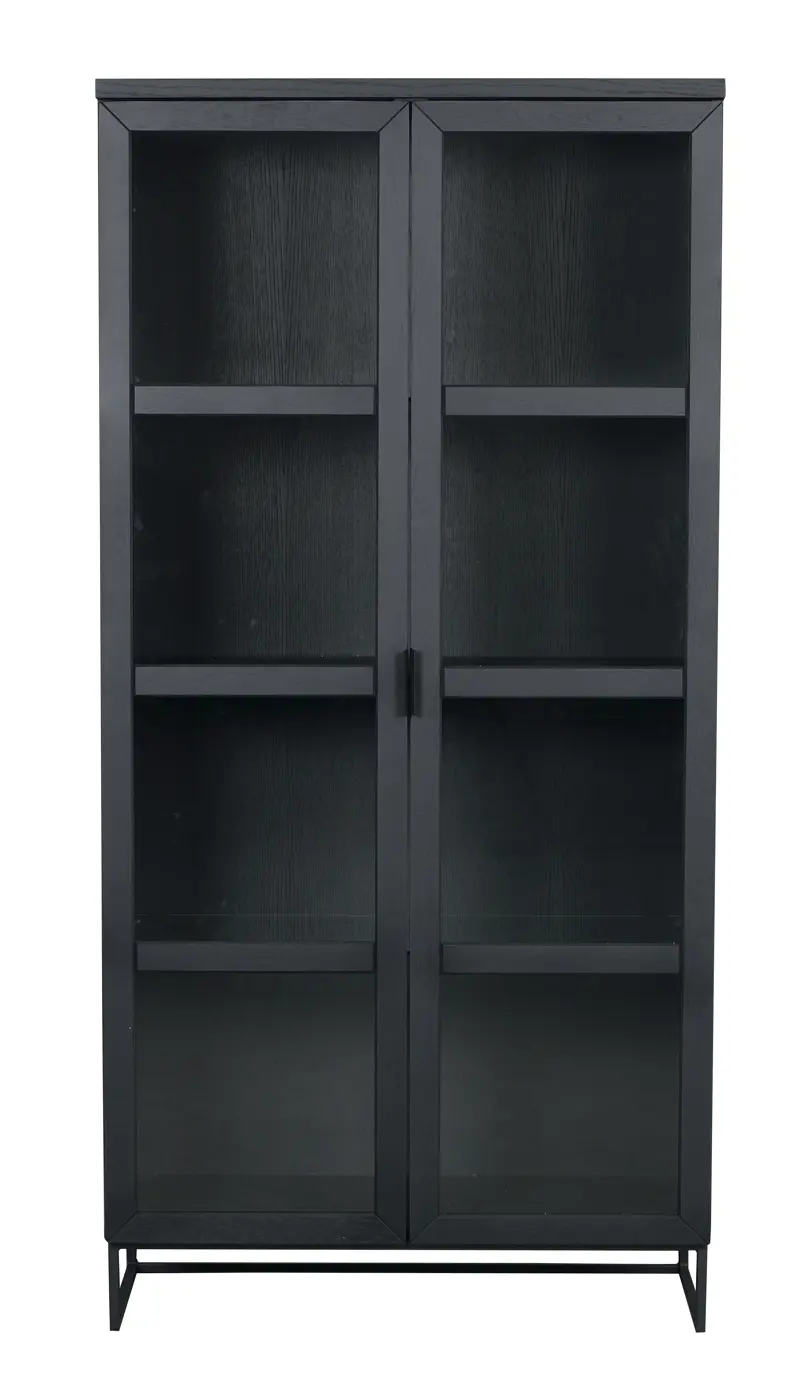 Everett er vandaður og glæsilegur glerskápur frá Rowico home úr svartri gegnheilli eik með svörtum stál fótum og handföngum ásamt glerhurðum með mjúkri lokun.