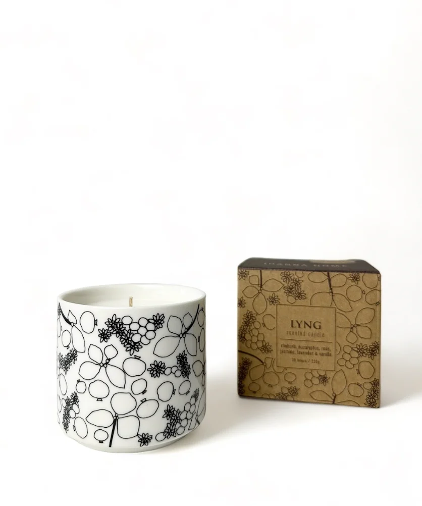Lyng ilmkertið kemur í fallegum keramikbolla sem tilvalið er að nota áfram sem kaffi/te bolla, blómapott eða hvað sem er. Stærð bollans er tilvalin fyrir cappuccino. Grafíkin á bollanum heitir Lyng og er innblásin af íslenskri náttúru og berjamó. Ilmtónar samantanda af appelsínu, kryddi, fjólum, blómum og kanil. Við mælum með að klippa kveikinn niður um 0,5 cm til að koma í veg fyrir svartann reik. Þessi vara er framleidd af viðurkenndum framleiðsluaðilum í Kína með náttúrulegum ilmolíum og soja vaxi.