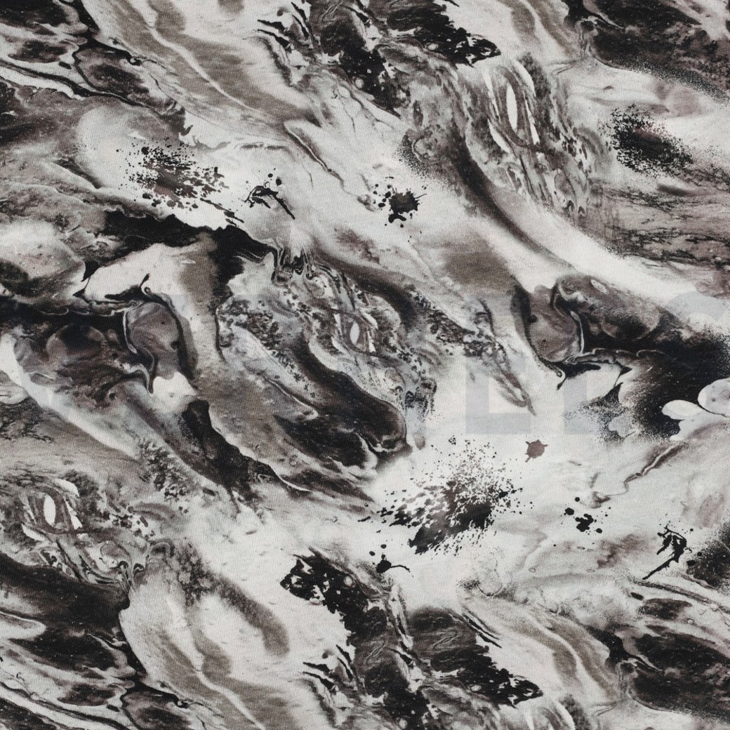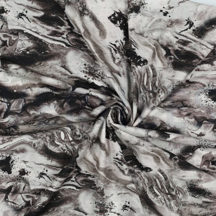 Mjúkt og teygjanlegt prjónað jersey-efni með marmaramynstri.