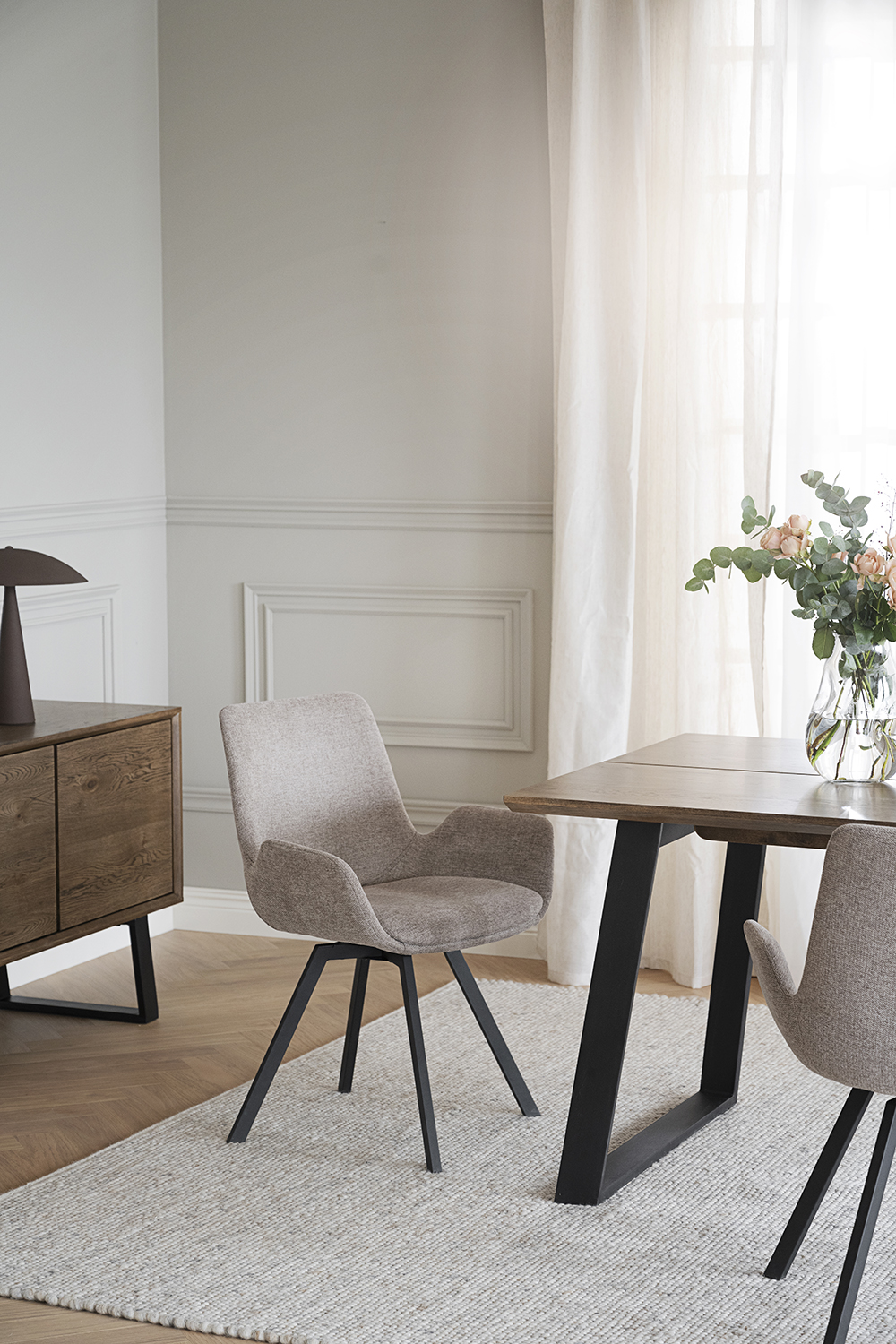 Norwell hægindastóll frá sænska merkinu Rowico. Stóllin er úr gráu efni, sætið er með 360 gráðu snúningi, stóllinn er bæði nútímalegur og þægilegur. Hann passar við borðstofuborðið og veglegri eldhúsborð. Fæturnir eru úr svörtum málmi. Fæst drapplitur (eins og hér) og grár.