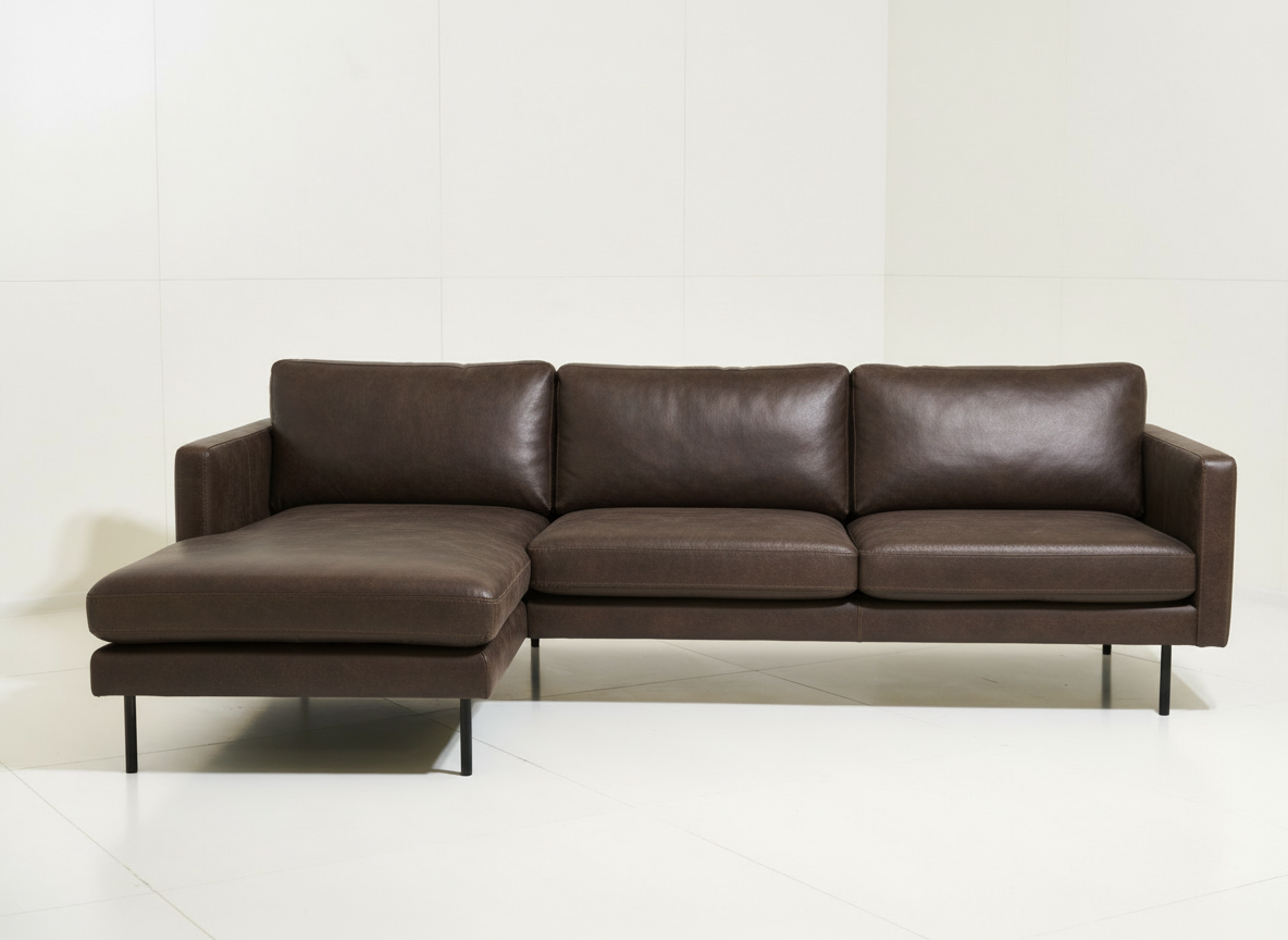 Vandaður og stílhreinn Sicilia tungusófi frá Kauno Baldai sem er innblásinn af skandinavískum minímalisma. Sófinn er úr fallegu, dökkbrúnu leður áklæði og er einstaklega þægilegur.