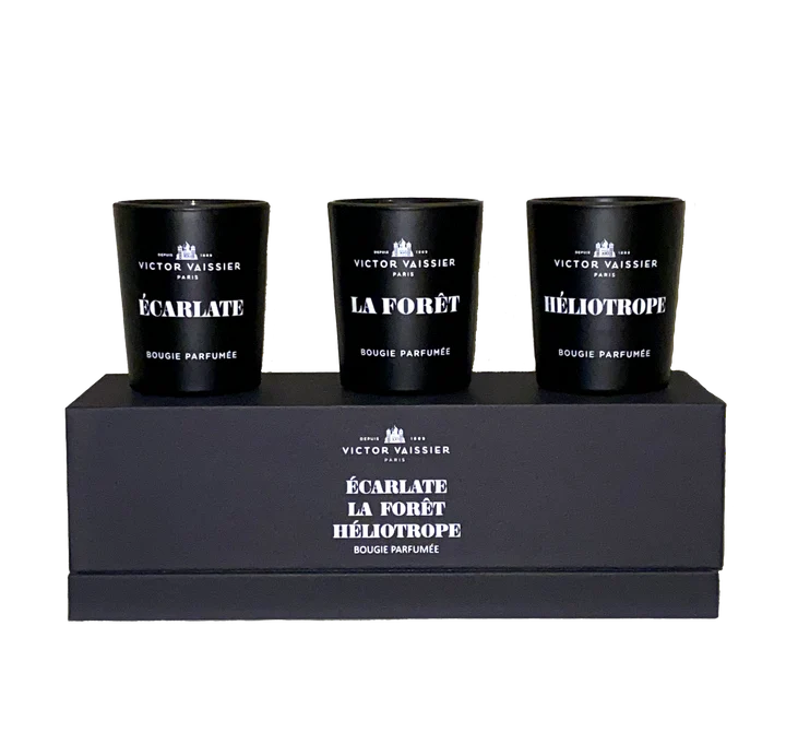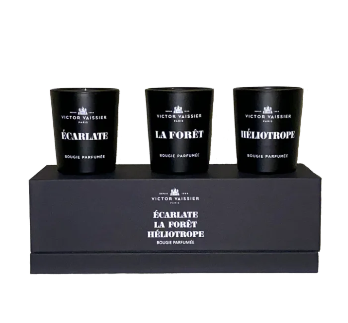 í kassanum eru 3 mini kerti með mismunandi ilmum frá Victor Vaissier: Héliotrope, La Forêt & Écarlate.