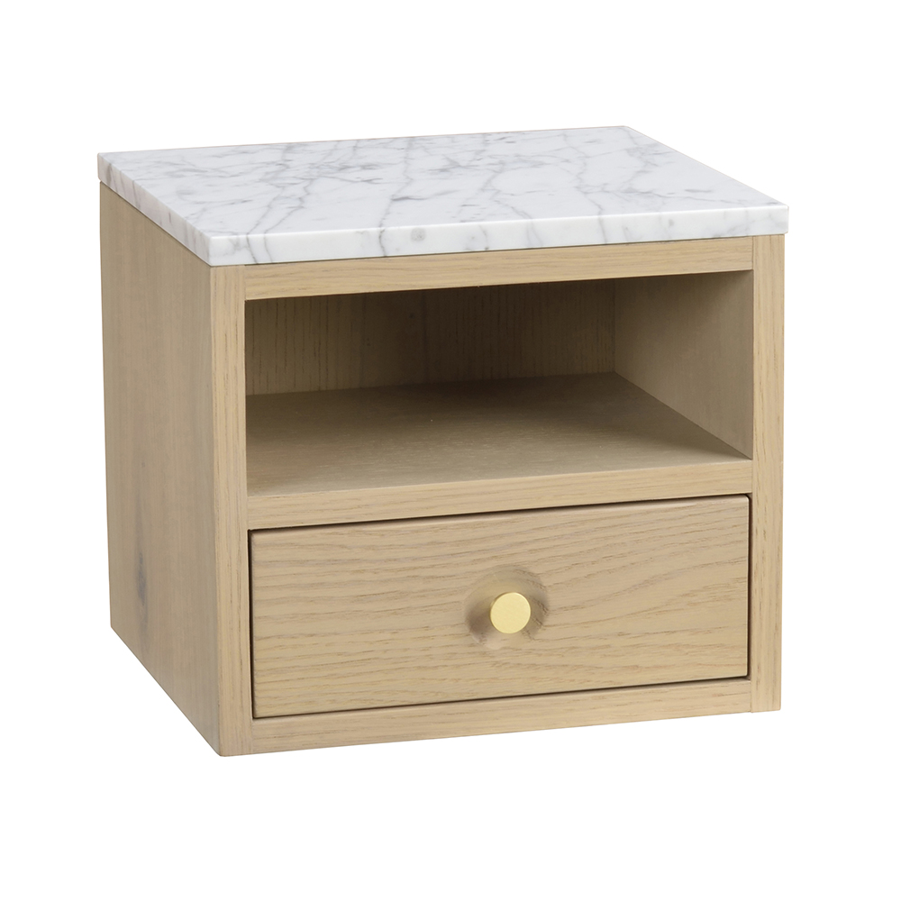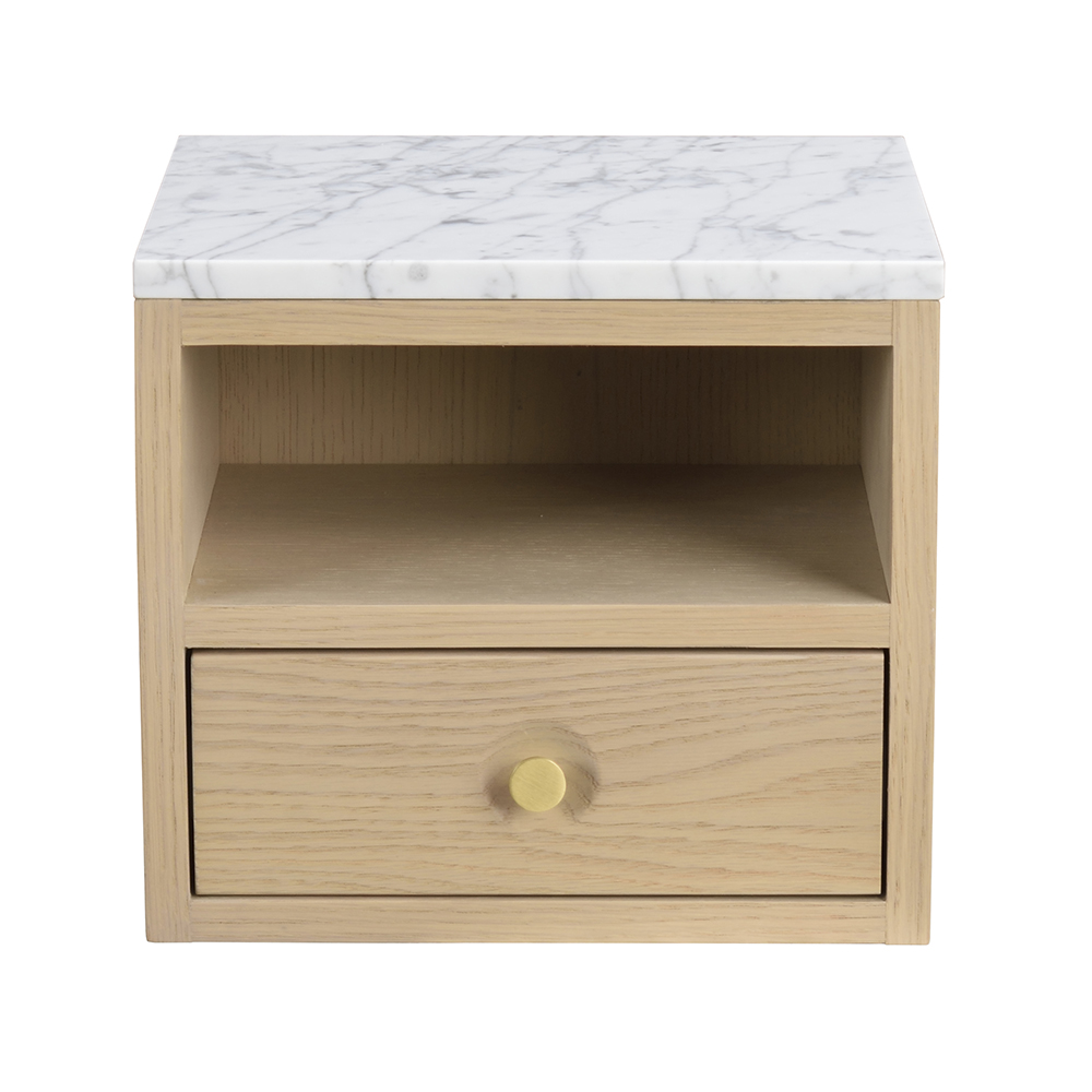 Whitmore náttborð úr hvítþveginni eik. Glæsileg hönnun með toppi úr hvítum marmara og skúffum með fallegum koparlitum hnúðum. Whitmore hentar annað hvort fyrir svefnherbergið eða ganginn. Veggfesta hönnunin skapar fljótandi tilfinningu og auðveldar öll þrif og þér að halda snyrtilegu.
